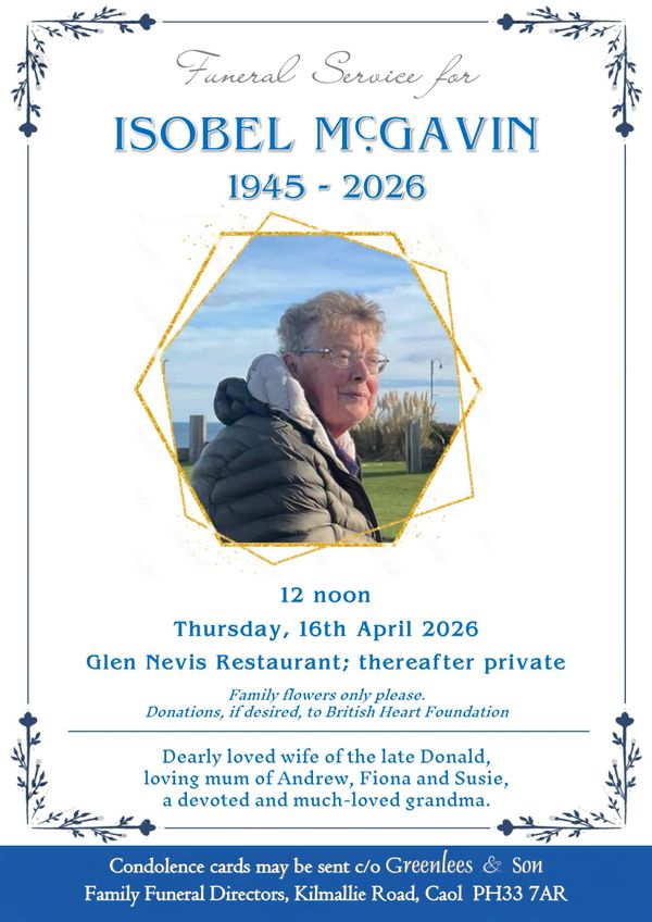 Suddenly, while enjoying a wonderful family gathering, Isobel Letham McGavin (née Rough), passed away peacefully on Saturday, 4th April 2026 at Victoria Hospital, Kirkcaldy. A dearly loved wife of the late Donald, loving mum of Andrew, Fiona and Susie, devoted and much-loved grandma, dear sister of James and John, a special and good friend of many.