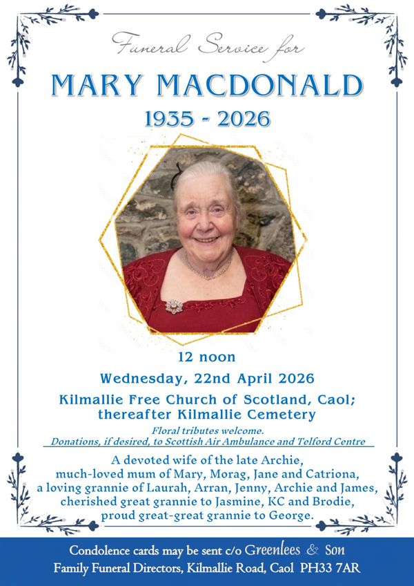 Funeral service will be held at 12 noon on Wednesday, 22nd April 2026 in Kilmallie Free Church of Scotland; thereafter Kilmallie Cemetery. Floral tributes welcome. Donations, in lieu of flowers, to The Telford Centre and Scottish Air Ambulance can be given at the service.